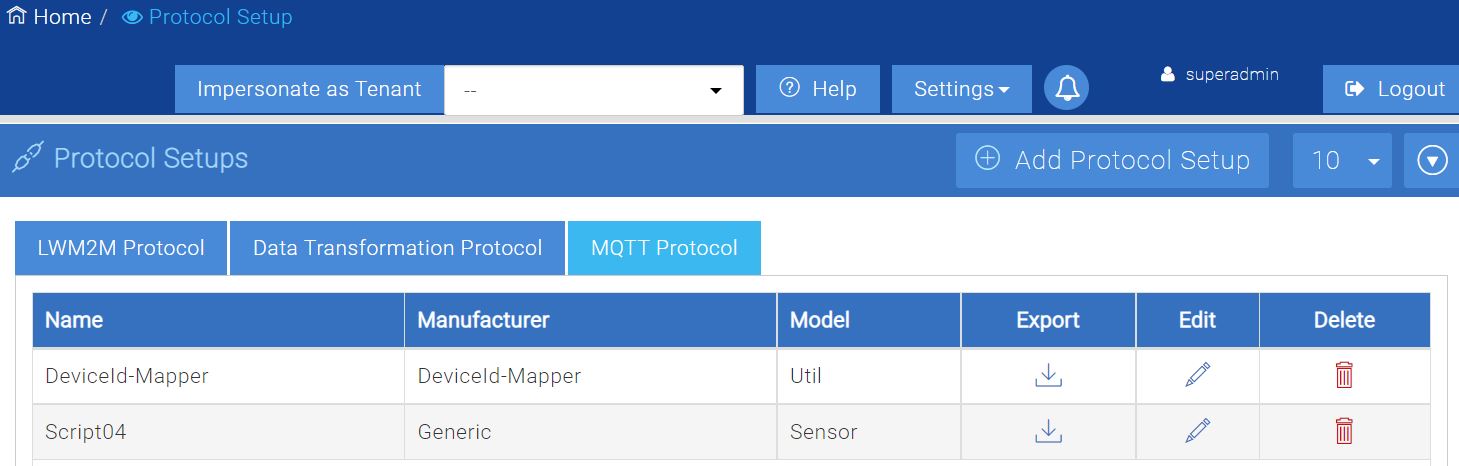 The MQTT protocol setup tab displays the list of mapping scripts added in IMPACT IoT. These scripts can be deleted.